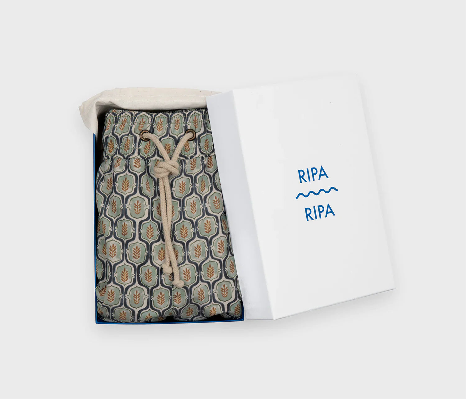 The classic swim shorts were redesigned for a more elegant, tailored look and a comfortable fit. Made from soft, brushed fabric that is quick-drying and has a distinctive cotton-feel. Tying cord made from braided nautical rope in unbleached cotton. Pattern drawn by hand. Made in Italy.